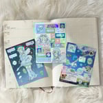 Holographic vinyl sticker sheets featuring my original character, the galaxy angel! The other one features a fruitiger theme + my dog!